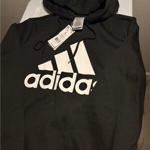 Classic black hoodie with bold white Adidas logo. Comfortable and stylish for everyday wear.