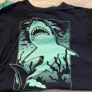 Bundle of 2! Great condition! 100% cotton. Dive into fun with these vibrant shark-themed t-shirts. Perfect for adventurous kids, these shirts feature bold shark graphics in blue and black. Comfortable and stylish for everyday wear.