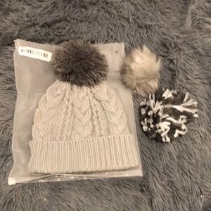 Chic gray cable knit beanie with detachable pom-poms. Versatile and stylish for any occasion.