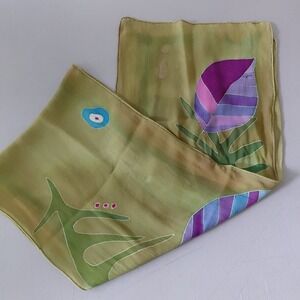Signed Silk Oblong Scarf 100% Silk Handmade Artsy Boho Green Leaf Sheer Handmade