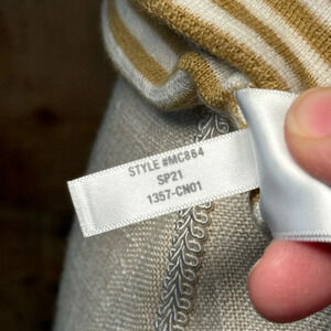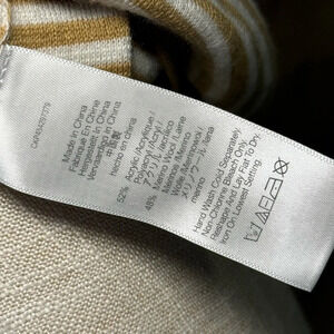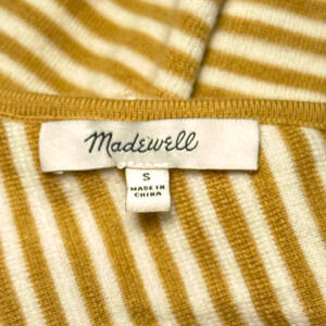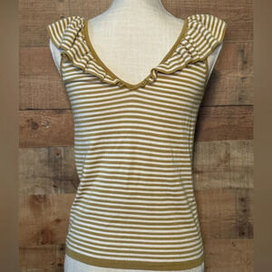 Madewell Belhaven Ruffle Sweater Tank in a women's size Small. Made of a soft merino wool blend, this cream and camel striped top has a slim shape and a ruffled front and back neckline. Super soft, comfortable and super flattering