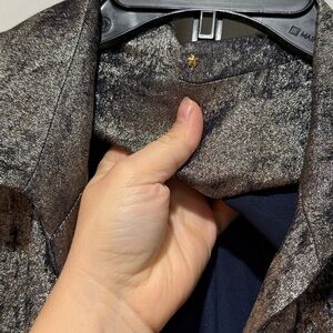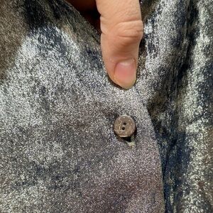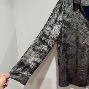 Elegant and effortlessly chic, this Peter Cohen “Rocker” topper blazer features a stunning silver velvety foil finish that catches the light beautifully—perfect for layering during the holidays or adding a touch of luxe to your everyday look.