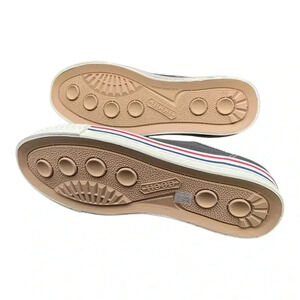 -Burnished Blue and red striped foxing and reinforced toe guard.