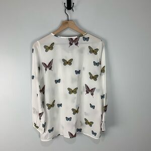 Pre-owned, good condition. Button up white blouse with ruffles on chest and multicolored butterflies. Pit to pit= 19”, shoulder to hem= 26.5”