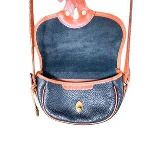 Chic crossbody bag with a sleek black body and tan accents. Ideal for versatile styling.