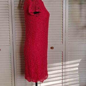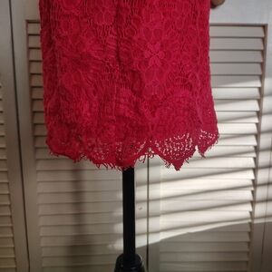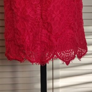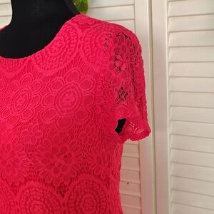 Gorgeous Laundry by Shelli Segal cocktail mini in vibrant hot pink lace. Fully lined, short sleeves, crew neck, and fitted silhouette – elegant and sexy!