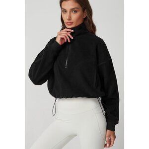 Women's Black Half Zip Fleece Short Pullover Long Sleeve Cozy Sherpa Sweater