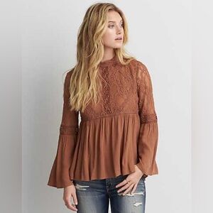 Elegant lace top. Features long bell sleeves. Lined bodice. Perfect for casual wear.