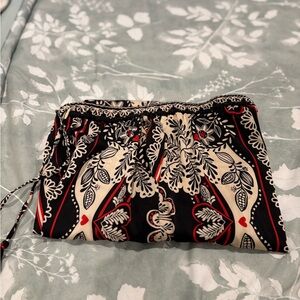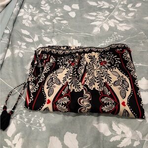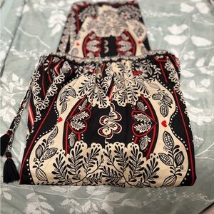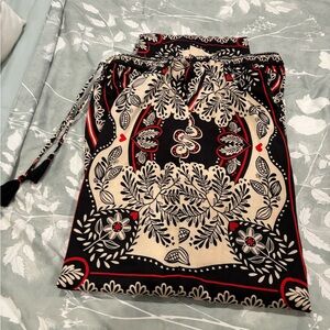 Elegant straight leg pants. Features intricate black and cream pattern. Accented with red details. Drawstring waist for comfort. These silky pants also have pockets. They are so comfortable and so soft. You will want to wear them everyday. They will look great with a t shirt or a dress shirt. There are so many colors you choose from to match a shirt with.They are between a straight leg and a wide leg.