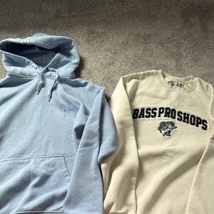 Stay comfortable with the Bass Pro Shops cream sweatshirt. Enjoy the outdoors in the Guy Harvey light blue hoodie. Perfect for casual outings. Very soft!