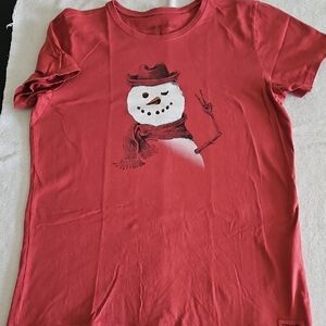 Set of two womens shirts. Black shirt with gold christmas tree design. Red shirt with snowman. Red shirt is "Life is Good" brand. Black shirt is "Digiprint Apparel " brand. Both size large. Red shirt is 100% cotton. Black shirt is a combination of cotton and polyester. Very good condition. From a non-smoking home.