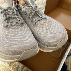 Light gray Hoka sneakers, barely worn. Few scuffs here and there that are pictured but likely can come off with a scrub! Will ship with box and additional laces.