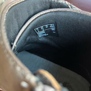 The Clarks Cloud Steppers Gathered Rushed Metallic Taupe Pretty Ankle Boots in size 6.5 offer a comfortable and stylish option for women. With a flat heel and cushioned insole, these boots are perfect for casual, workwear, or travel occasions. The ankle shaft style, round toe shape, and solid bronze brown color make them versatile and easy to wear. Made with leather upper material and a rubber outsole, these boots are both durable and water-resistant. The hook & loop + zipper closure adds convenience and adjustability for a personalized fit. Overall, these Clarks Cloud Steppers are a great addition to any woman's wardrobe.