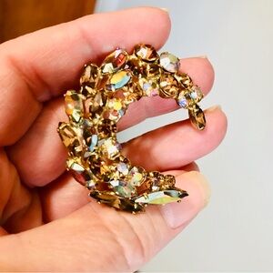 Stunning vintage half-moon/crescent rhinestone brooch measuring approximately 2” x 2”. Features rich amber aurora borealis crystals with a strong rainbow effect, in varying sizes, arranged in a beautiful, well‑balanced design.