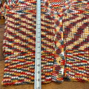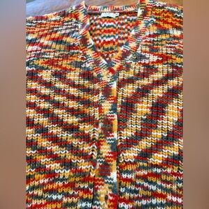 Vibrant knit cardigan with a multicolor pattern. Features red, orange, and yellow hues.