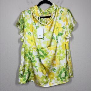 Emily Wonder Large Shirt Blouse Yellow Floral Ruffled Neckline Flutter Sleeves