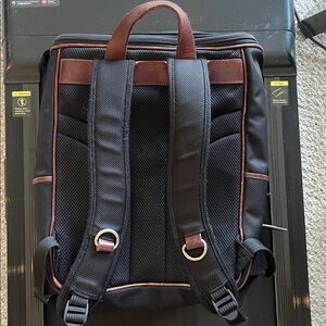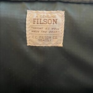 Stylish Filson backpack. Features black fabric with brown leather accents. Front pocket with buckle closure. Durable and versatile design.