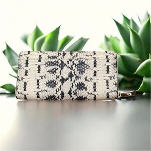 Stylish Coach clutch with a striking python pattern. Features a sleek black and cream design. Perfect for adding a touch of luxury to any outfit. Long zip around wallet.
