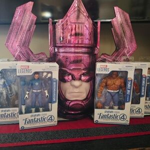 Marvel Legends Galactus figure with Fantastic Four action figures. Includes Mr. Fantastic, The Thing, and Human Torch. Features vibrant pink and blue colors.