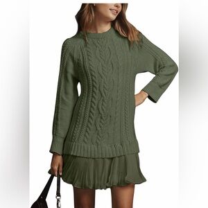 🆕Twofer Style Cable Knit Crewneck Long Sleeve Pleated Mini Dress