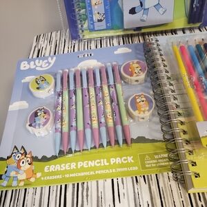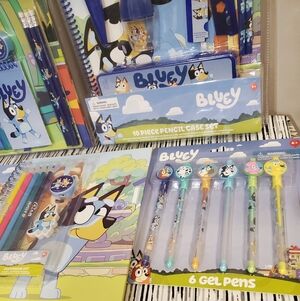 Fun Bluey stationery set. Includes pencils, erasers, scissors, rulers, sharpeners notebooks and more. Perfect for school or home use.