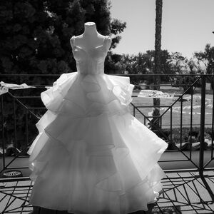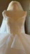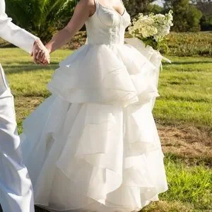 Stunning white wedding dress with layered skirt. Perfect for a special day.