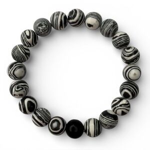 Add a touch of monochrome elegance with this black‑and‑white malachite bracelet. Each matte‑finished bead features soft marbled patterns that create a sculptural, refined look. A single solid black bead adds contrast and balance, giving the bracelet a clean, contemporary finish.