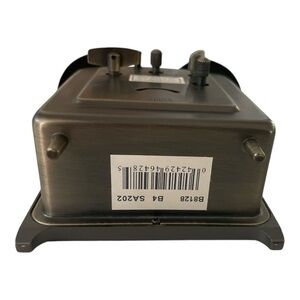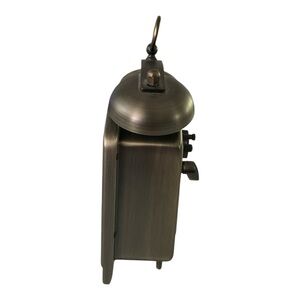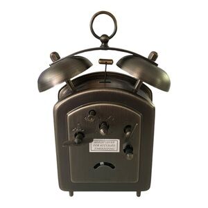 Make a dramatic statement with this Bulova Holgate mechanical twin bell alarm clock B8128. It offers a round cream dial with black luminous hands and Arabic hour markers, and subdial at 12 o'clock position. It's framed in a cast metal case with antique bronze finish and protected by glass crystal. It also features a 36-hour key wind mechanical twin bell on top. No battery required.