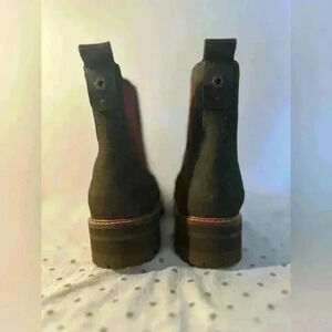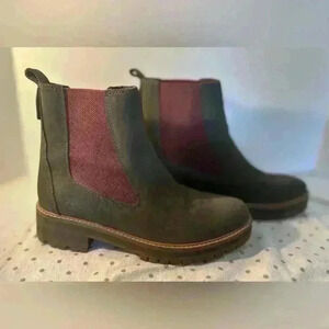 NWOT Timberland pull on lug boots with magenta elastic gore and khaki/sage upper. Heat duty and pretty too. Great look for fall and nice in the rainy weather. 2” heel