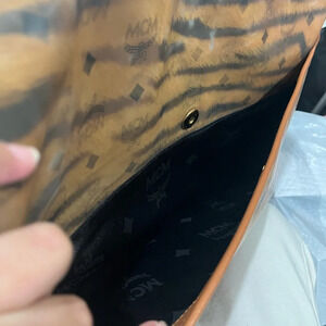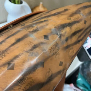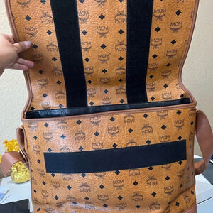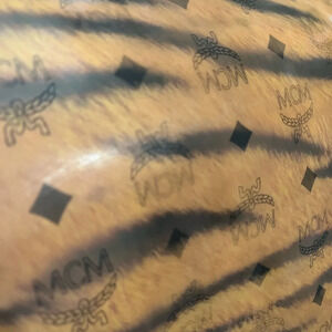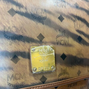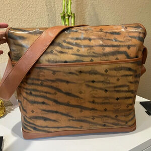 Authentic pre-loved. MCM Visetos leather with laminated MCM tiger patter fur. Some light spots on the laminate. Wide adjustable strap; can be worn as a shoulder bag or crossbody. Velcro strap for closure. Has a back pocket. Perfect for travel, work or as a diaper bag.