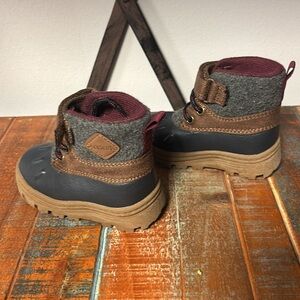 Keep your childs feet warm and stylish with these cozy brown and gray duck boots. Perfect for any adventure.