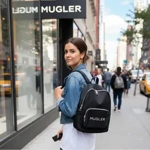Sleek Mugler backpack with iconic branding. Ideal for modern style. Functional and chic.