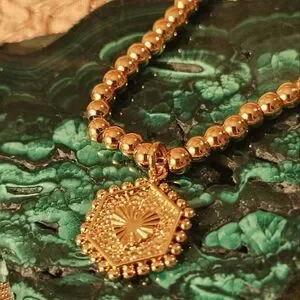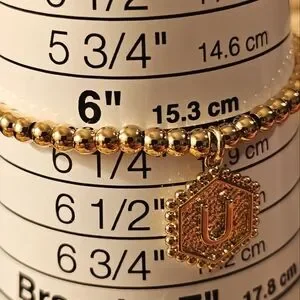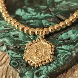 This stunning gold beaded bracelet adds a touch of elegance to any outfit. Perfect for any occasion. Initial letter "U" on one side, heart on back.