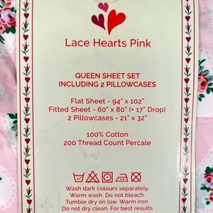 Cath Kidston "Queen Sheet Set in Lace Hearts on Pink" NWT