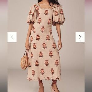 Charming midi dress with puff sleeves. Cream base with red floral design. Scalloped hem adds elegance.