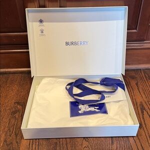 Burberry Gift Box. Includes ribbon, stuffing later and envelope. Size is 14 inches by 10 inches. Height is 2.5 inches.