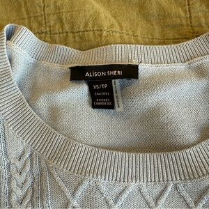 Elegant short sleeve knit top by Alison Sheri. Features a sophisticated cable pattern in a versatile baby blue shade. Perfect for any occasion.