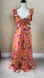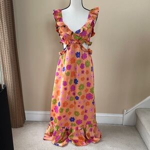 Vibrant floral maxi dress with ruffle details. Features a colorful pattern with cut-out sides.