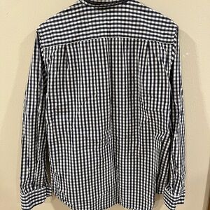 This Merona “classic fit” shirt features a navy and white checkered pattern, perfect for a casual day out. Crafted with a comfortable fit, it offers a timeless style with its pointed collar and long sleeves. Ideal for adding a touch of sophistication to your everyday wardrobe.