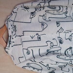 M Et'Lois top, made in the USA, white 3/4 sleeve collared top, asymmetrical hemline, black square buttons, abstract pattern of scribble faces and clocks, crinkle gauze texture. measurements can be found in the photos. excellent pre-owned condition.