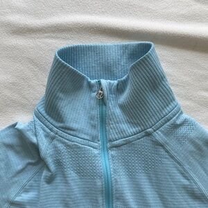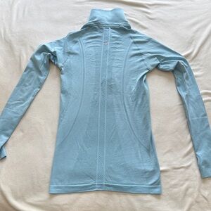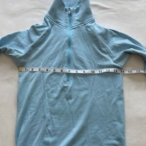 Light blue long-sleeve top, lightweight and super soft/ stretchy. Features a half-zip design. Thumbholes for added comfort. Great base layer. Excellent used condition, no stains. From a smoke free home.