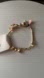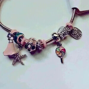 Gold tone, charms include pink, rhinestone, green and gold spacers, gold crown, gold MADE WITH LOVE, large bead with pink, green and cream circular designs, pink and white dress, starfish, and a colored lollipop. Perfect gift for a girl, mom, etc.