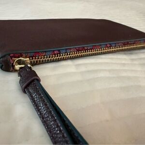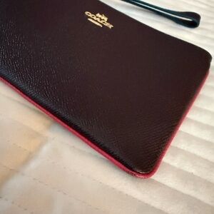 Classic Coach wristlet in rich wine colored leather with a slim, polished profile. Features gold-tone hardware, a detachable wrist strap, and a secure zip-top closure. The interior offers multiple card slots and compartments—perfect for everyday essentials, travel, or using as a clutch.
