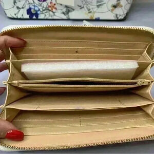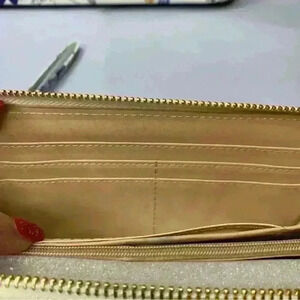 This new handbag and wallet make a beautiful ensemble. The handbag has a zipper opening only in the center. The wallet has plenty of slots for credit cards and ID. The handbag is missing 1 rivet. Please see photos before purchasing. Wallet and Handbag come as a set.