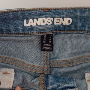 Lands'end women's recover denim pants, size 6, straight leg, high rise, light blue, 29 inseam, stretch, 72% cotton, 27% polyester, 1% spandex, 28 in waist, length of 39 in, 5 pockets, casual outfits, lightly used, excellent condition.