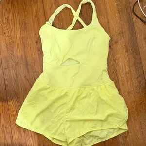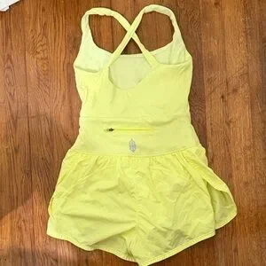 Bright yellow athletic dress featuring a stylish cross back design, zipper pocket, and open cutout in front. Perfect for activewear. Used but like new condition. Size XS.