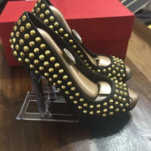 Rock Republic Black Stilettos Gold Studded Peep Toe Platform Shoes Women's 37