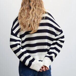 Openwork knit fabric. Medium knit. Striped design. Oversize design. Rounded neck. Long sleeve.