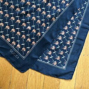 Approximately 21.5”x22.5” with framed polo motif pattern extending from upper left to lower right. Hand rolled edges. Mallet, ball, and polo helmet print in browns, tans, and white on black background. 100% silk with Gucci logo on lower right-hand side of scarf. In excellent vintage condition! A gorgeous luxury piece for elevating basics or mixing black and brown. Versatile, rare, and a truly special vintage piece.