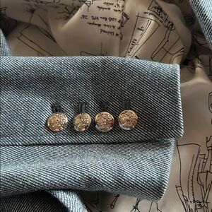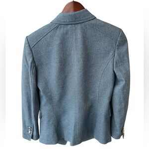 Elevated and timeless White House Black Market (WHBM) Studio blazer in a classic blue tweed with a nautical-inspired look. Fully lined with beautiful attention to detail, including gorgeous silver button hardware and artistic designs inside the lining, plus decorative buttons at the sleeve cuffs. Light shoulder pads provide flattering structure without bulk.